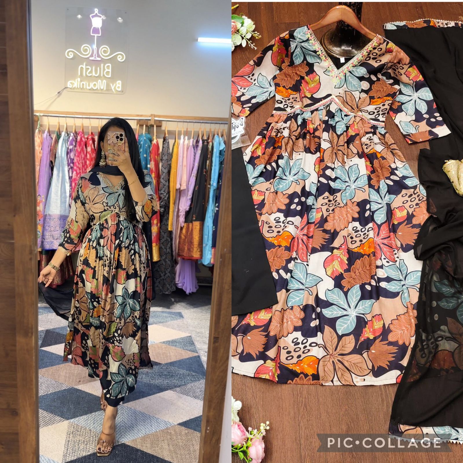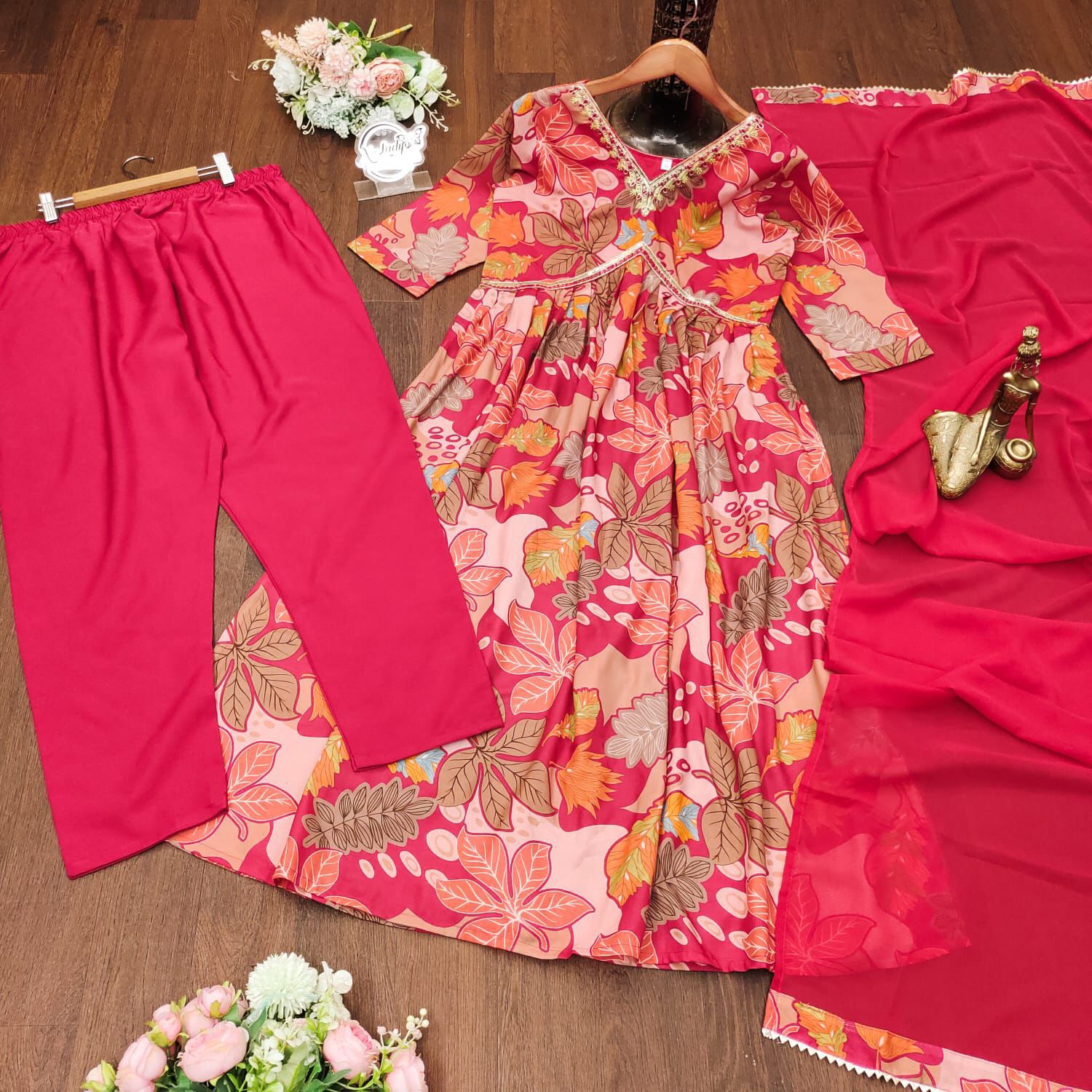 Featuring soothing yet😍 cottan print and full lining with pent and Nazneen dupatta with work lace 😘elegant printing 😍Alia cut gown with 2 Color. Maltiprint and pettern. It is a perfect outfit for any small gathering or function. It is very comfortable as it looks