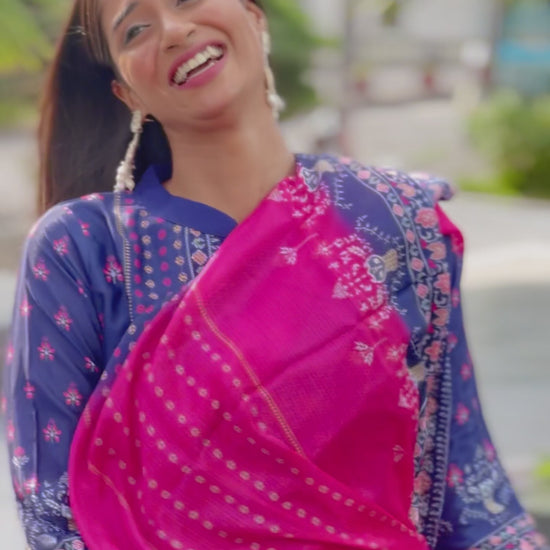 This is an elegant and eye-catching Chinon Kurta Set featuring a beautiful dual-tone design that transitions from dark navy blue to a bold fuchsia pink. The entire set is covered in a delicate, all-over pattern that gives the appearance of intricate embroidery. With matching patterned pants and a large, coordinating dupatta, this outfit is a perfect blend of modern color blocking and traditional patterns, making it a sophisticated choice for formal events, parties, or special occasions.