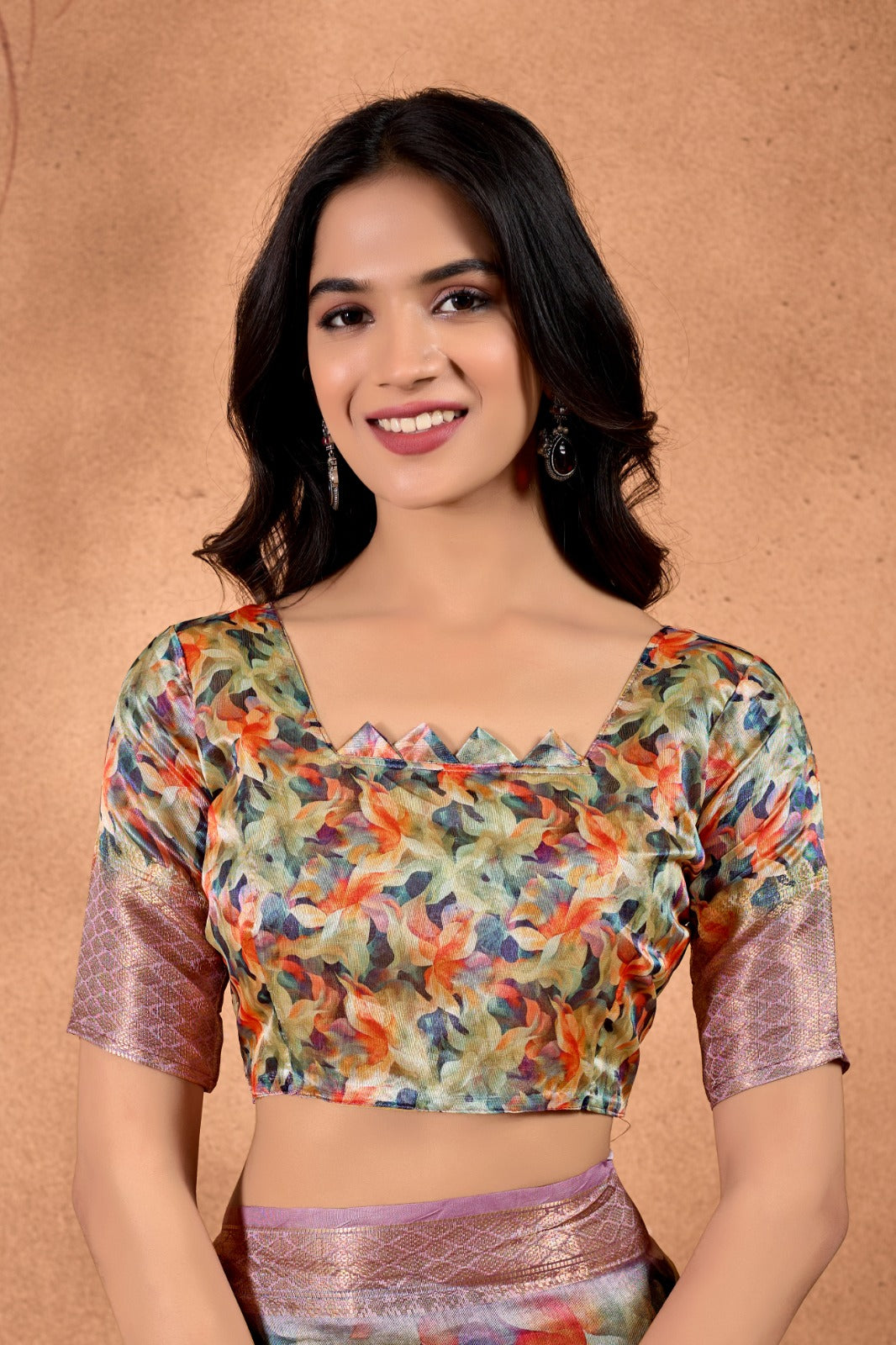 Drape yourself in artistic elegance with this multicolor soft silk saree featuring a mesmerizing abstract floral print that beautifully transitions into a traditional ethnic motif pallu. The intricate patterns in vibrant hues give it a regal charm, while the shimmering zari-woven lavender border adds an exquisite finish.