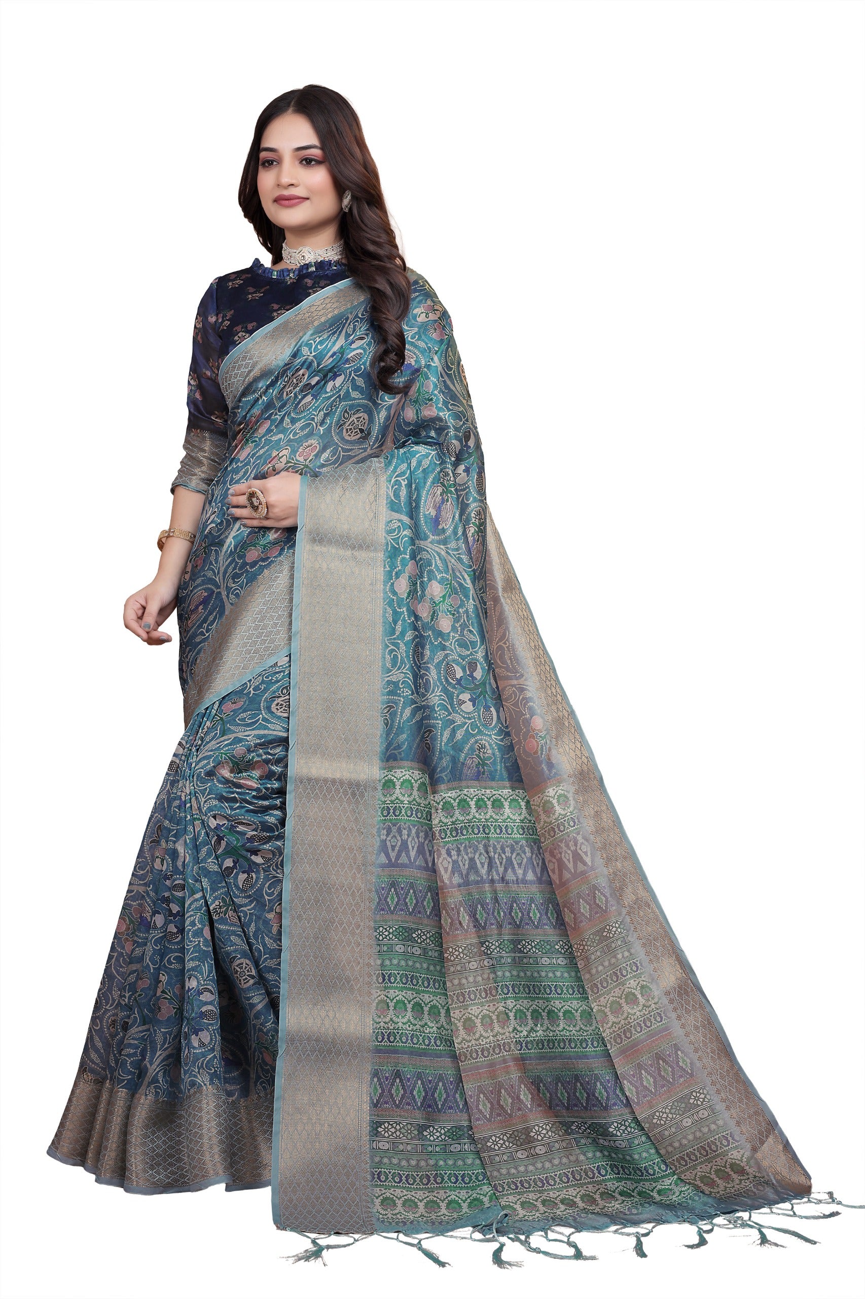 Peacock Blue Soft Silk Saree with Floral Zari Weave & Multi-Color Pallu