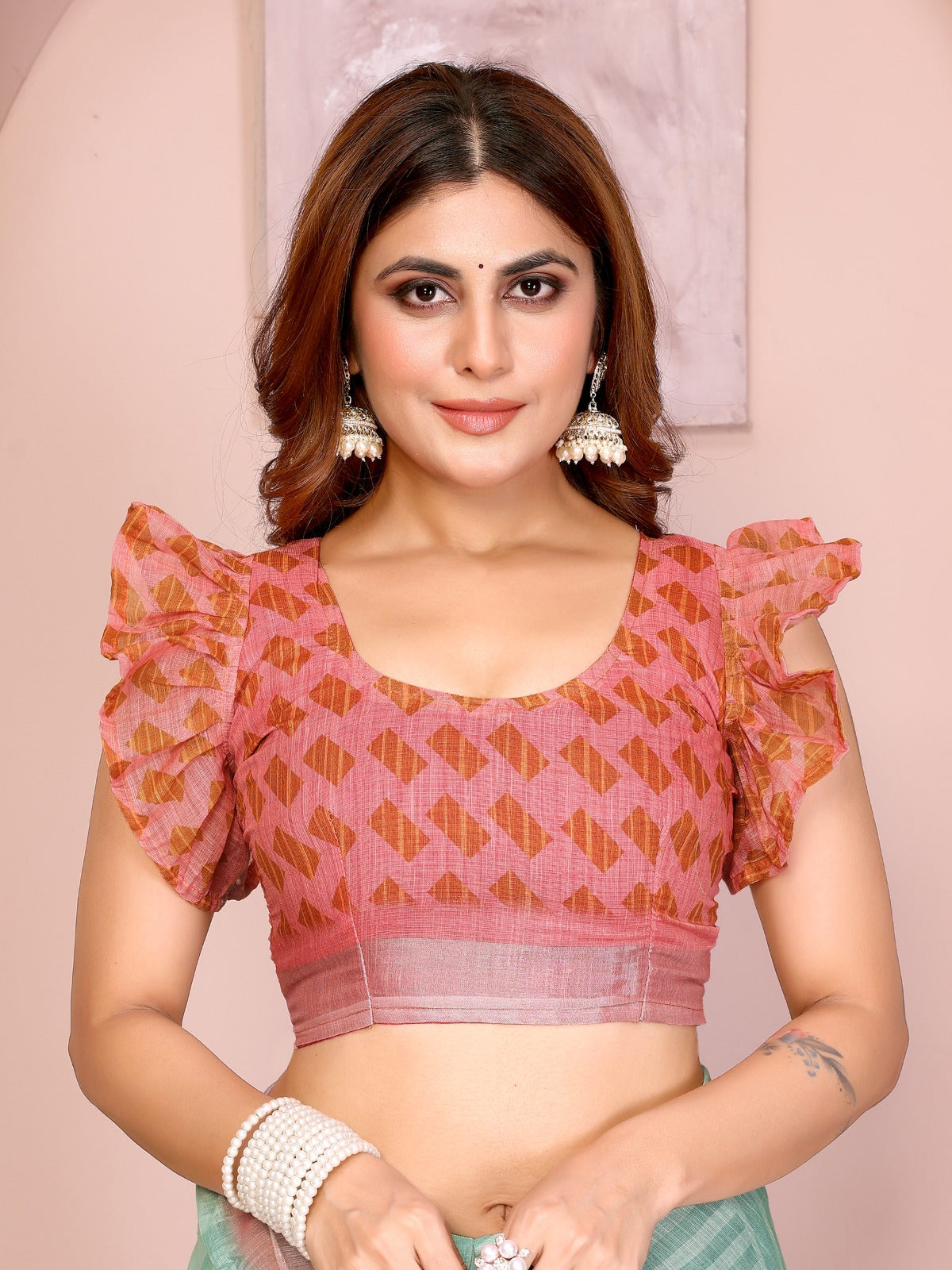 Embrace the freshness of pastel hues with this mint green linen cotton saree, designed for elegance and everyday comfort. The soft fabric ensures a lightweight drape, making it perfect for all-day wear. Adorned with charming pink floral prints, it beautifully blends modern style with traditional grace.